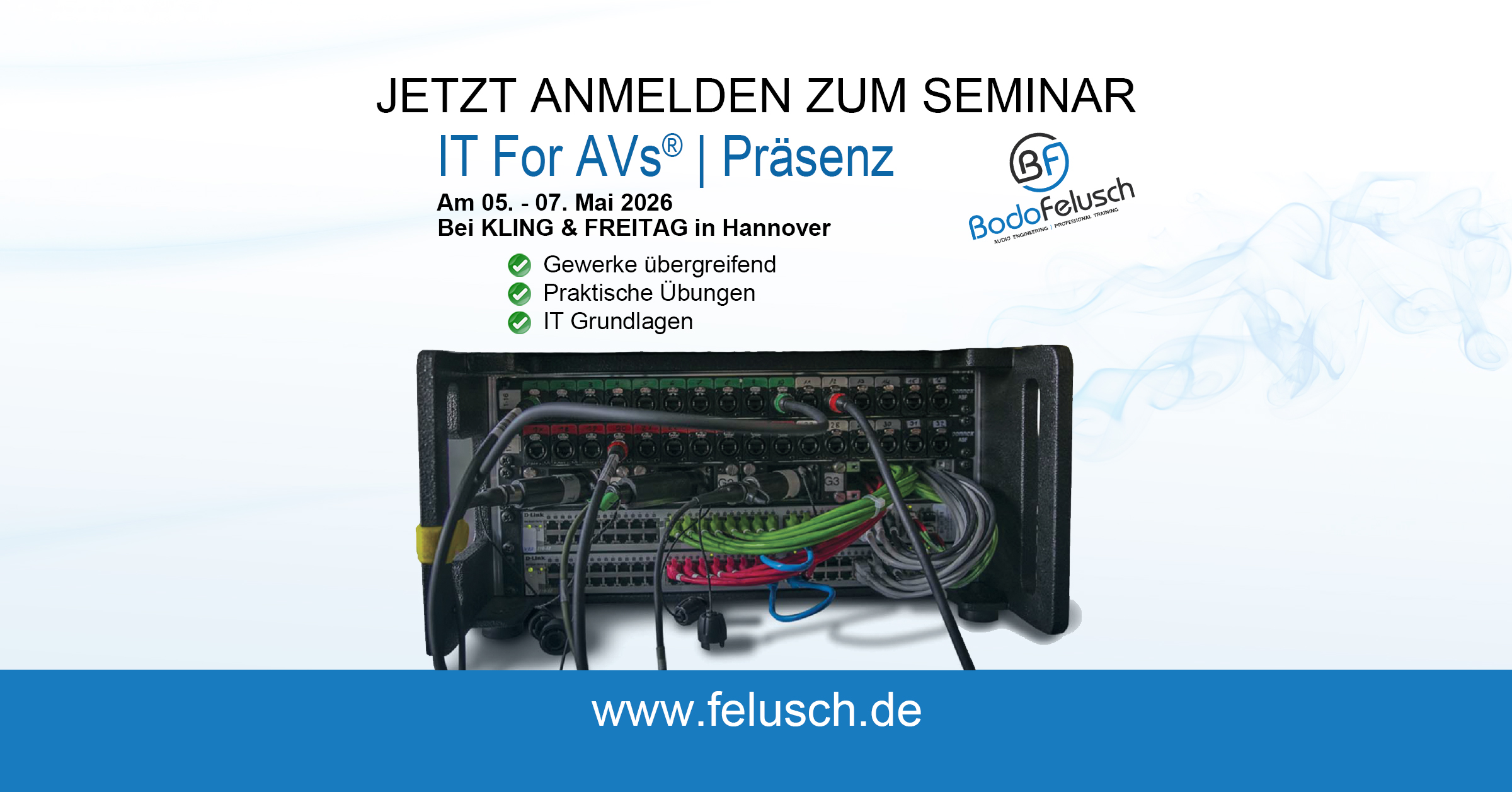 Das Seminar richtet sich an Techniker, Operator, Ingenieure und Fachplaner, die mit Audiovisuellen Medien tätig sind und IEEE 802 Ethernet Netzwerke für den Signaltransport nutzen. Die Teilnehmer benötigen keine Vorkenntnisse und werden von Grund auf in die IT Technologie eingeführt. Sie erlernen in den ersten drei Tagen des IT Grundlagen Kurses, die Sprache der IT Profis auf hohen Niveau zu verstehen, wobei der Fokus auf den für die Praxis der Teilnehmer relevanten Themen liegt. Die vermittelte Theorie wird in der Praxis angewandt. Die Teilnehmer konfigurieren einen Cisco CBS350 Switch für den Transport von Echtzeit Mediennetzen. Abgerundet wird das erste Modul mit einer Einführung in das Thema Netzwerk Monitoring mittels PRTG. Die ersten drei Tage des Seminars sind Gewerke übergreifend für Allrounder, Audio- Licht- und Video Spezialisten gleichermaßen geeignet.