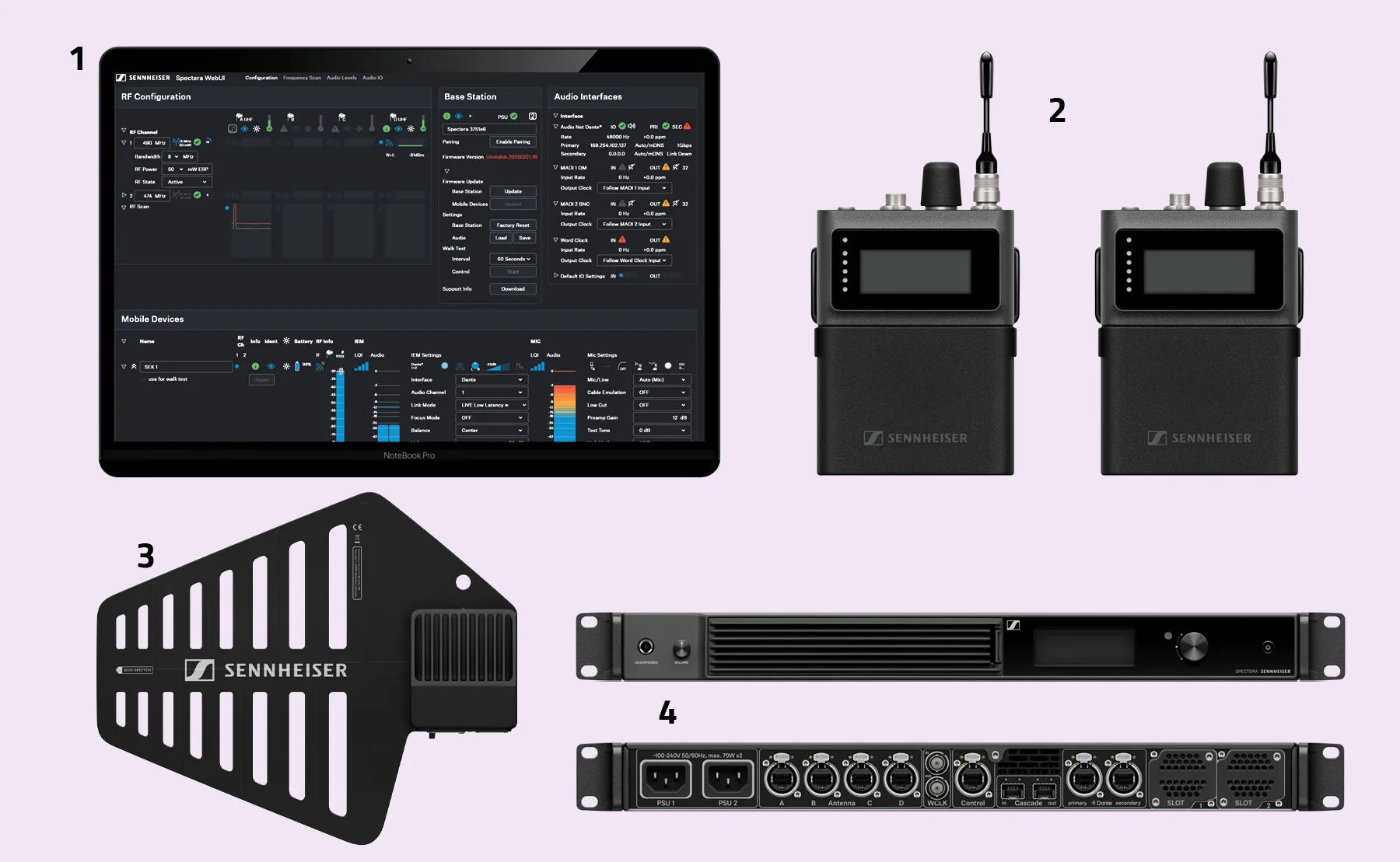 Die Komponenten des Systems: 1) Tabletdisplay, 2) Zwei bidirektionale Taschensender/-empfänger, 3) Richtantenne, 4) Basisstation (Front/ Back) (Zur Vergrößerung ins Bild klicken) © Sennheiser