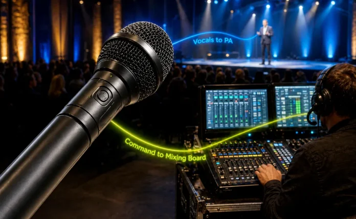 Die Idee scheint einfach: Ein digitales Funkmikrofon bekommt eine zusätzliche Taste. Wer die nicht drückt, sendet normal – Stimme geht auf die PA, in den Stream, auf Aufnahme, alles wie gehabt. Wer die Taste drückt, ändert damit das Audio-Routing. Das Signal läuft dann nicht mehr zur PA, sondern direkt an die Regie, zum Monitormischer oder an die Produktionsleitung. Das Publikum bekommt davon in der Regel nichts mit.